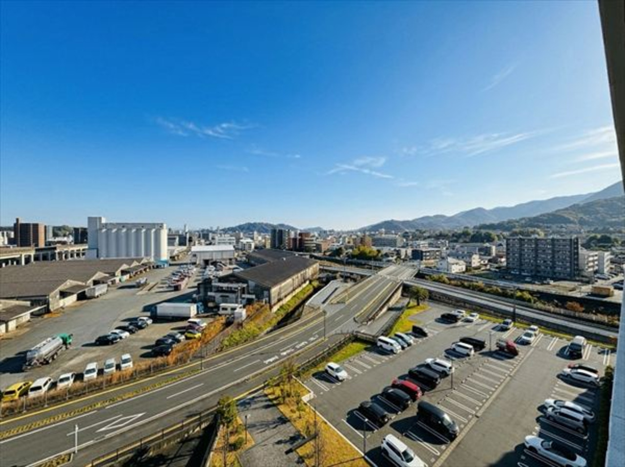 昼間は青空の下、遠くの山々まで見渡せる開放的な景色。